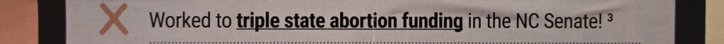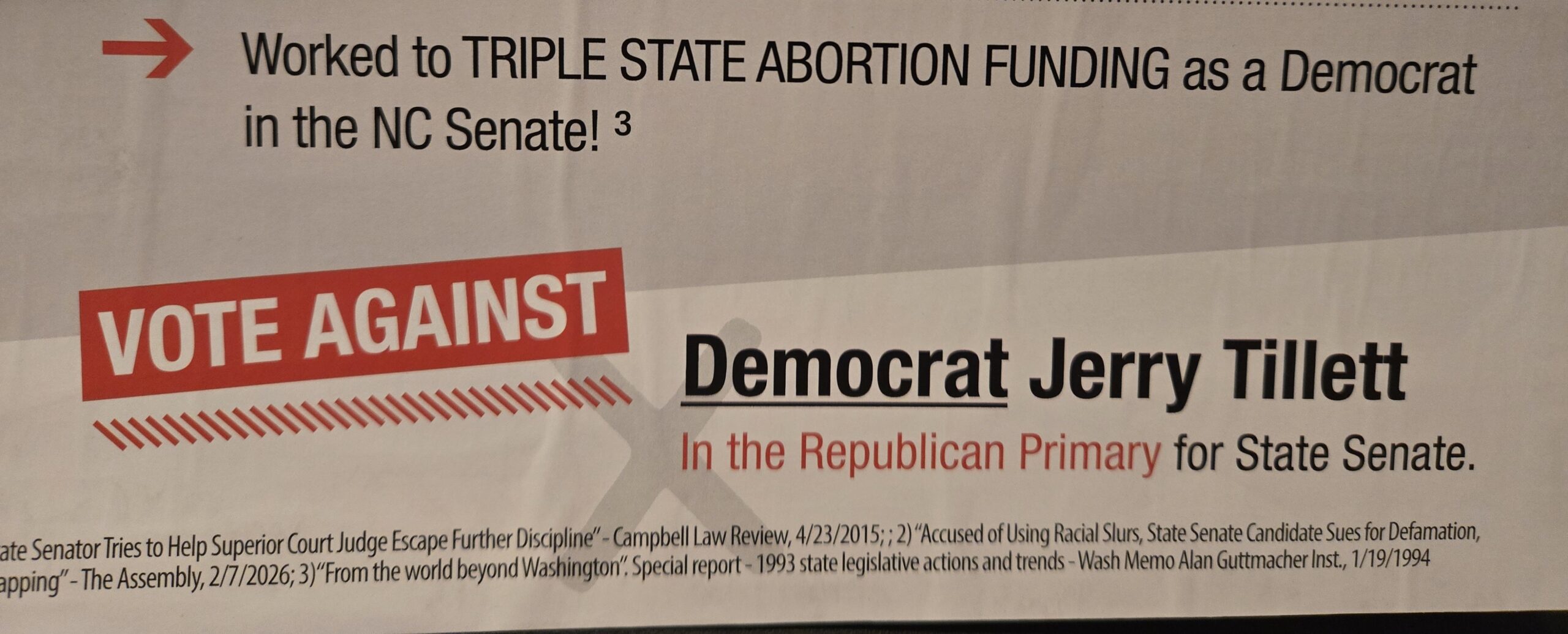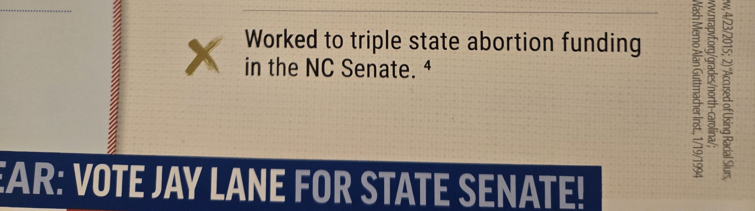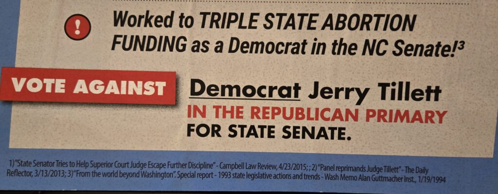 Jay Lane sent 4 mailers to voters homes that claimed Jerry Tillett worked to triple state abortion funding in the NC Senate.