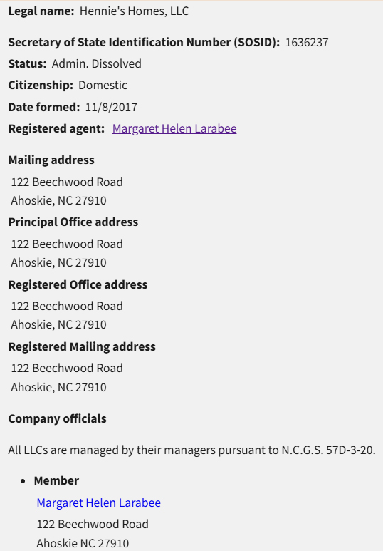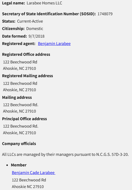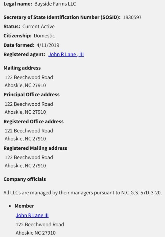 Multiple development related LLC’s are listed at the same address (122 Beechwood Road, Ahoskie, NC 27910) where his farm business (Bayside Farms) is listed. These are listed with the North Carolina Secretary of State’s office.