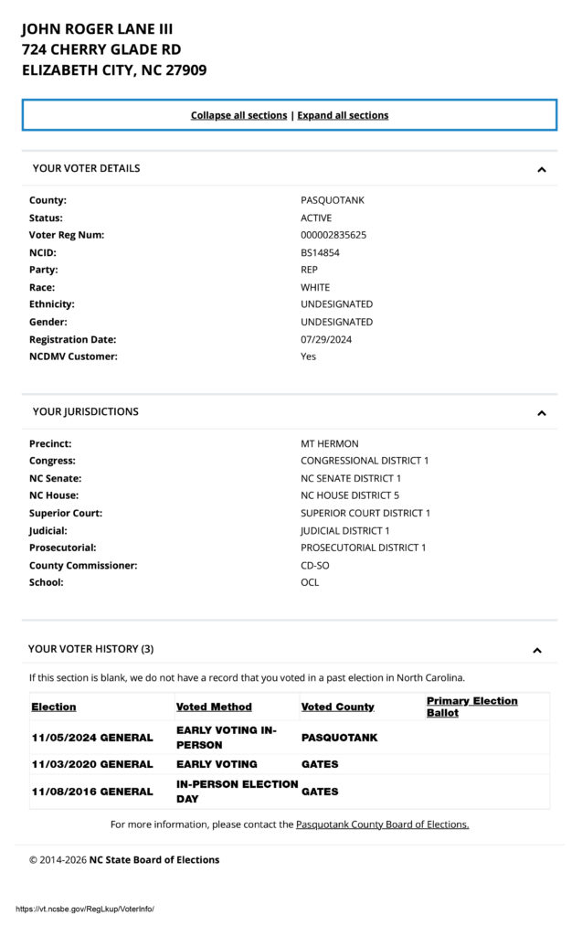 You can look it up yourself at https://vt.ncsbe.gov/RegLkup/. Note that Jay Lane’s real name is John Roger Lane III.